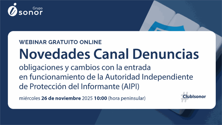 En Grupo Isonor organizamos el miércoles 26 de noviembre este webinar online gratuito sobre las novedades en el Canal Denuncias, tras la entrada en funcionamiento de la Autoridad Independiente de Protección al Informante (AIPI).